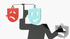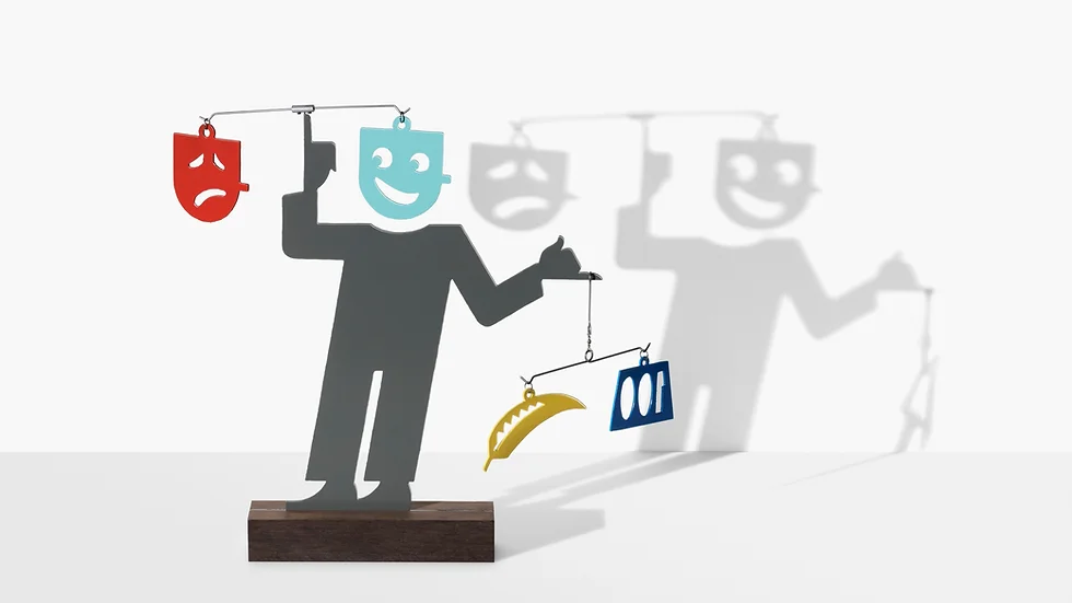 Door de wind of aanraking verandert het figuurtje van stemming: blij of zwaarmoedig.